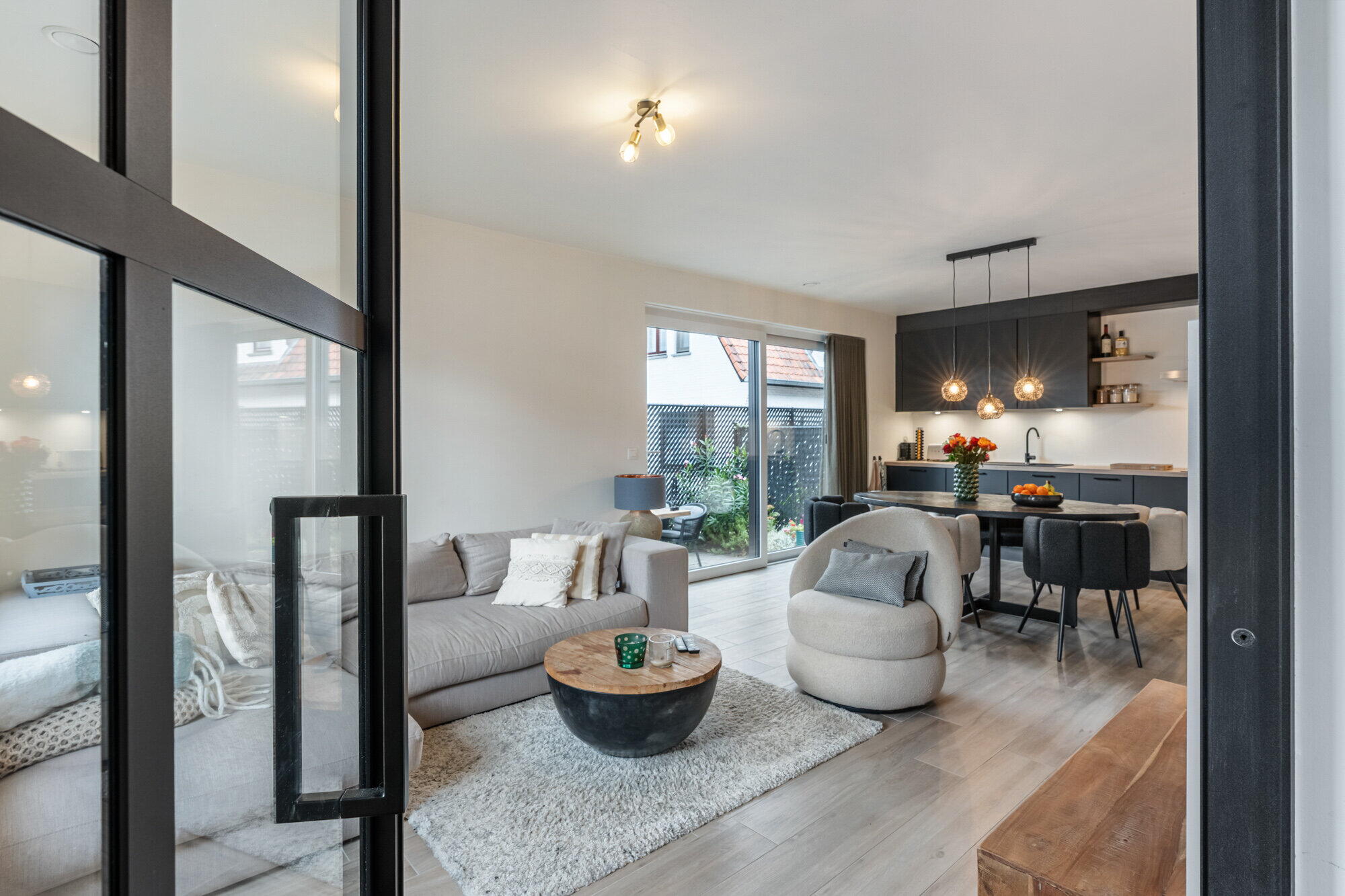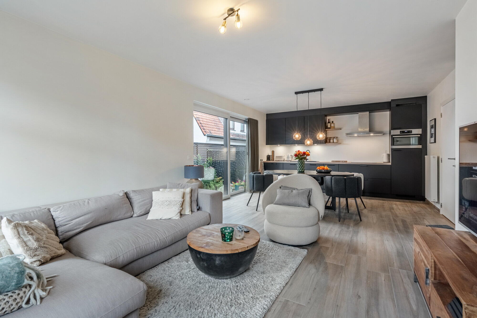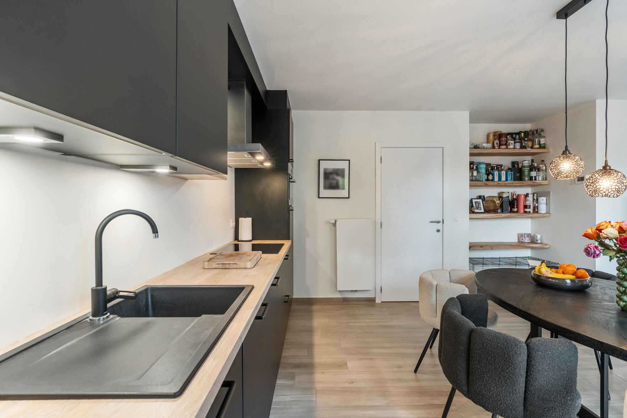 - De leefruimte met parkettegel staat in verbinding met de moderne open keuken. De keuken is voorzien van een afwasmachine, combi-oven, frigo, inductie kookplaat, dampkap, spoelbak en softclose keukenkasten;