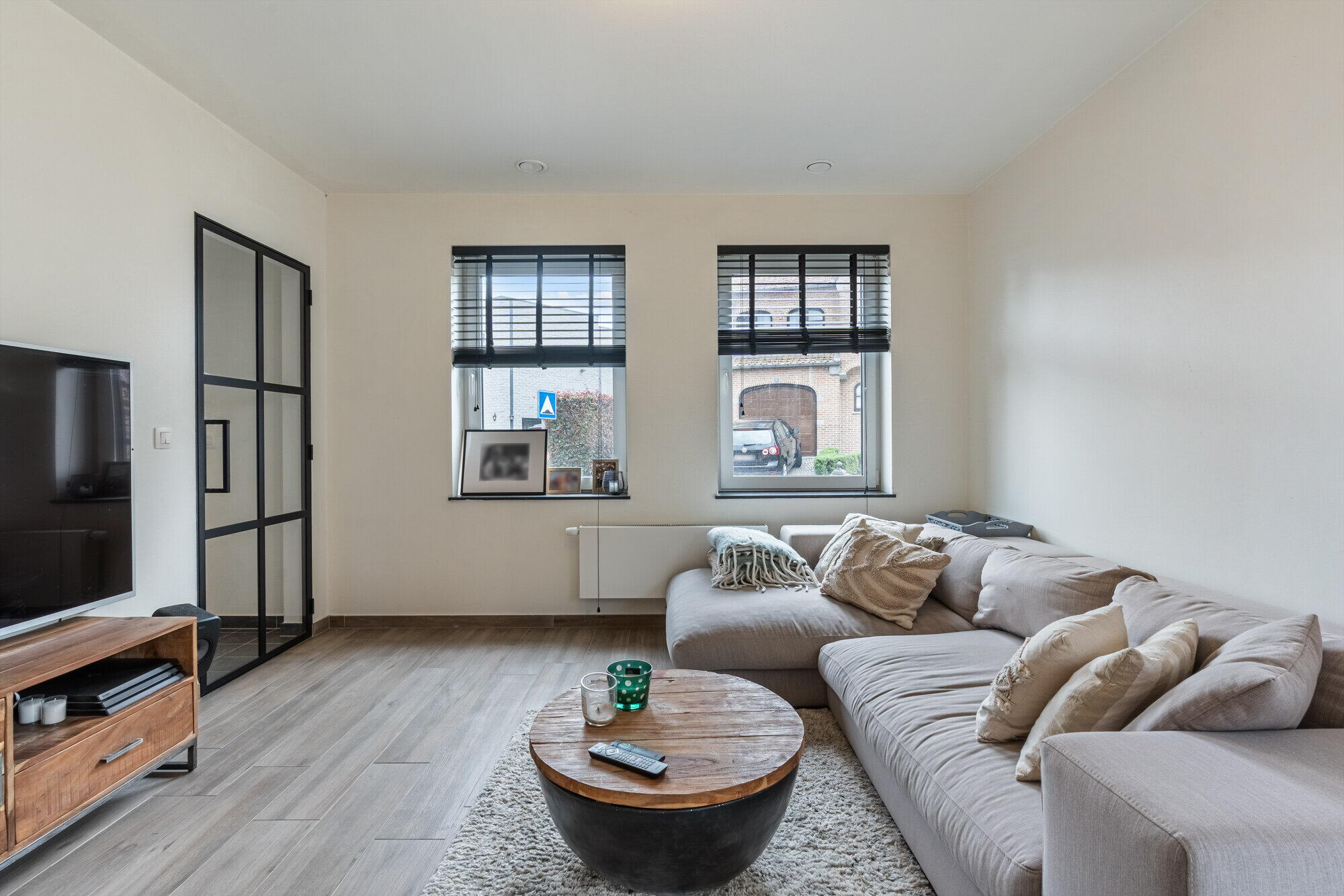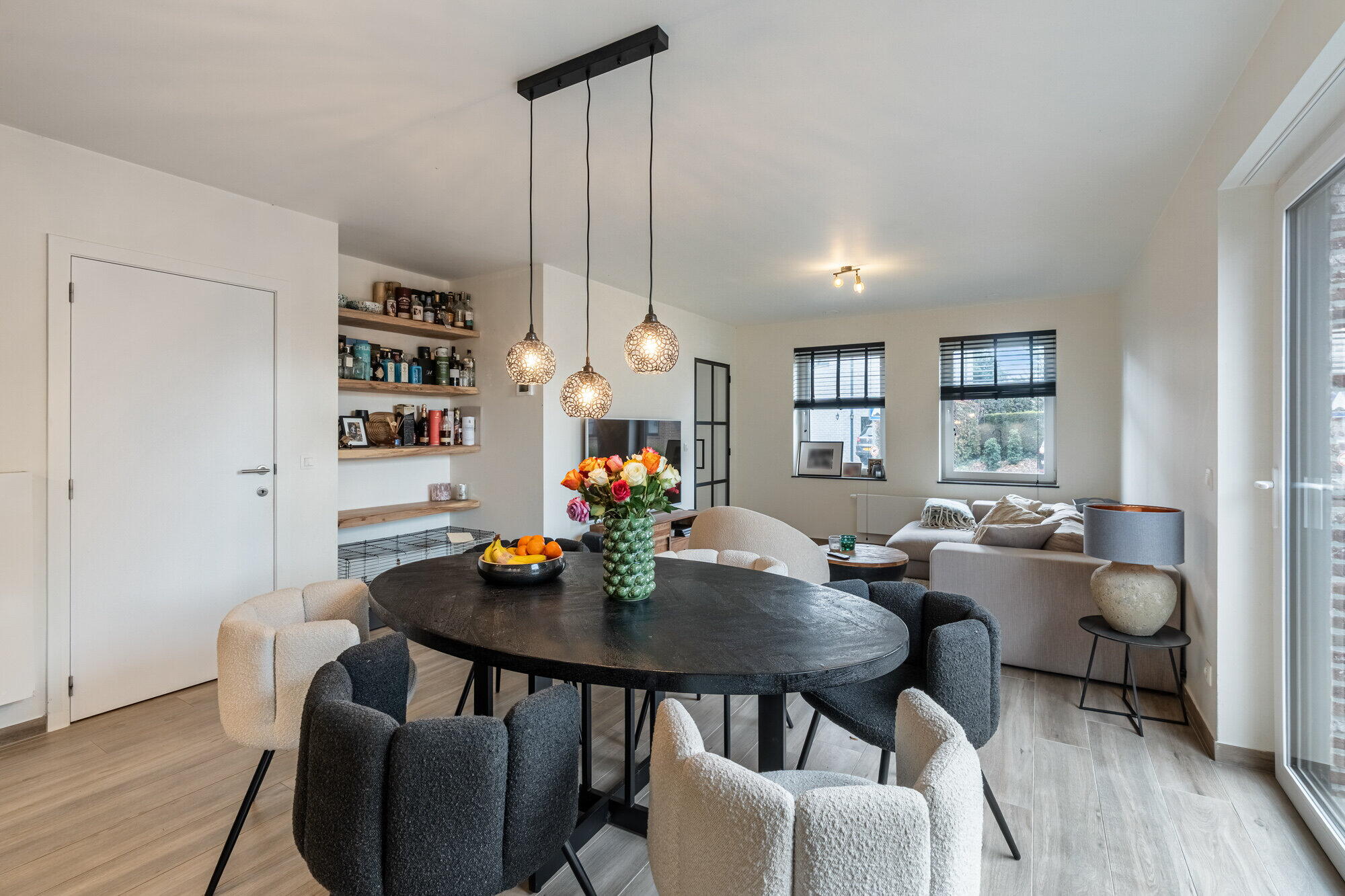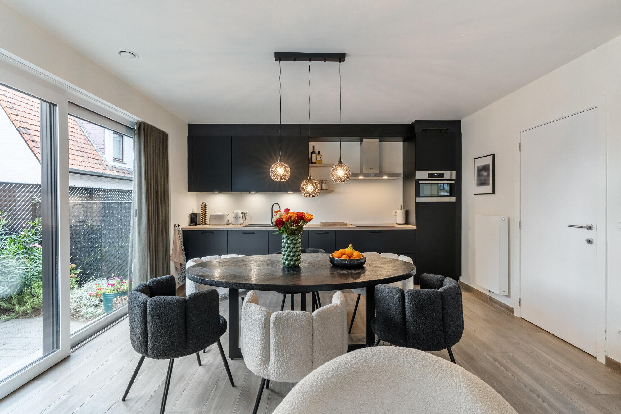 - De leefruimte met parkettegel staat in verbinding met de moderne open keuken. De keuken is voorzien van een afwasmachine, combi-oven, frigo, inductie kookplaat, dampkap, spoelbak en softclose keukenkasten;