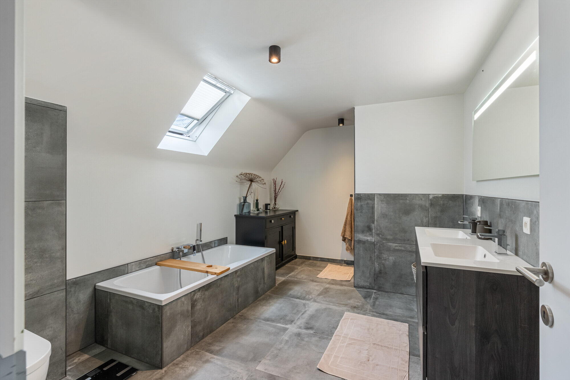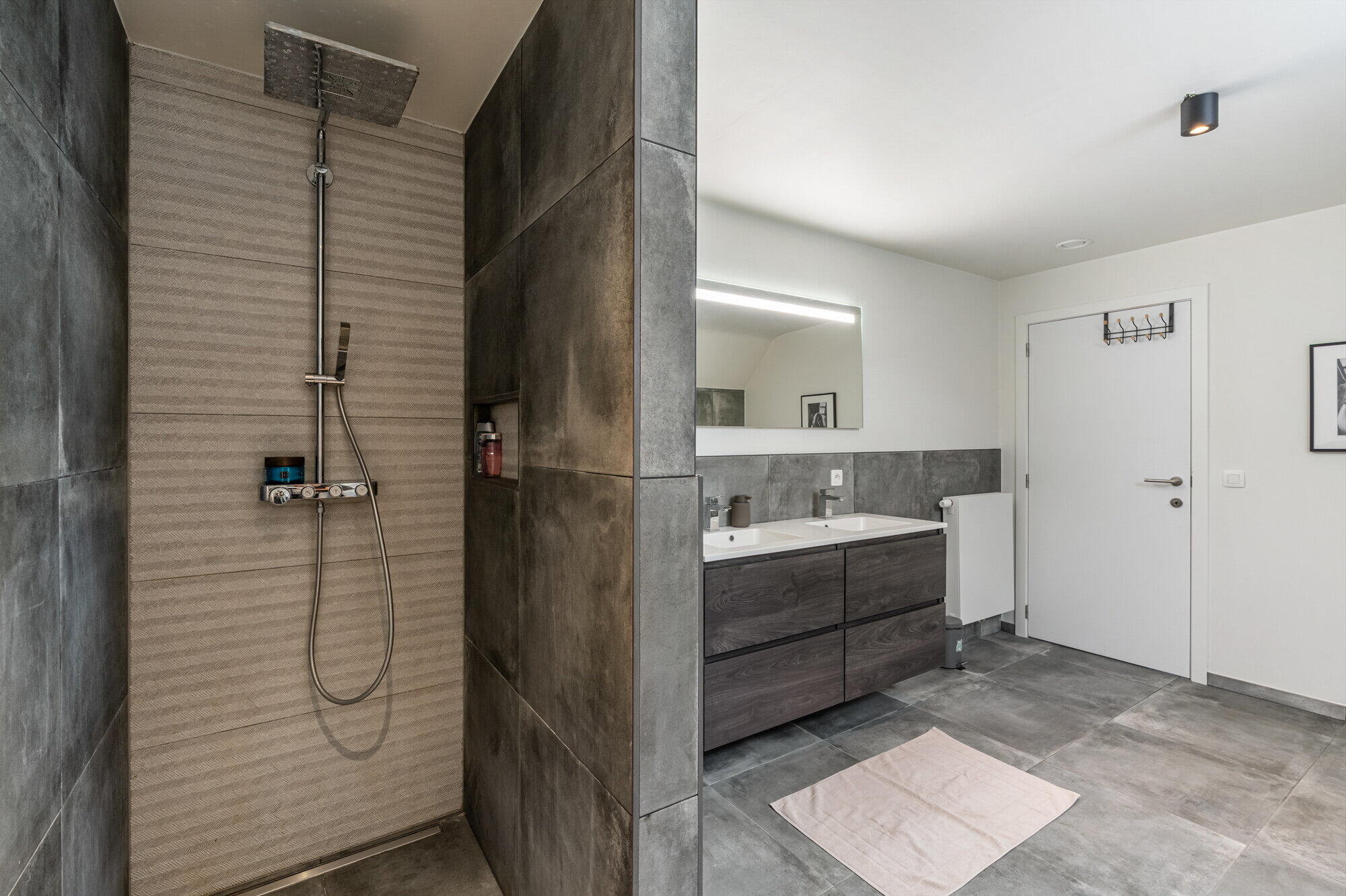 - De badkamer is voorzien van een toilet, ligbad, inloopdouche met regendouche, dubbele lavabo en verwarmde spiegel met verlichting;